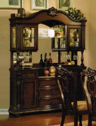 Dimension 67W x 21D x 91H Finish Cherry Material Wood Mirror Glass China Cabinet Buffet Hutch with Mirrored Back in Cherry Finish Features mirrored back Carved details on apron and bun feet design Two cabinets with glass shelves in front of the mirror for display and storage Wine glass st